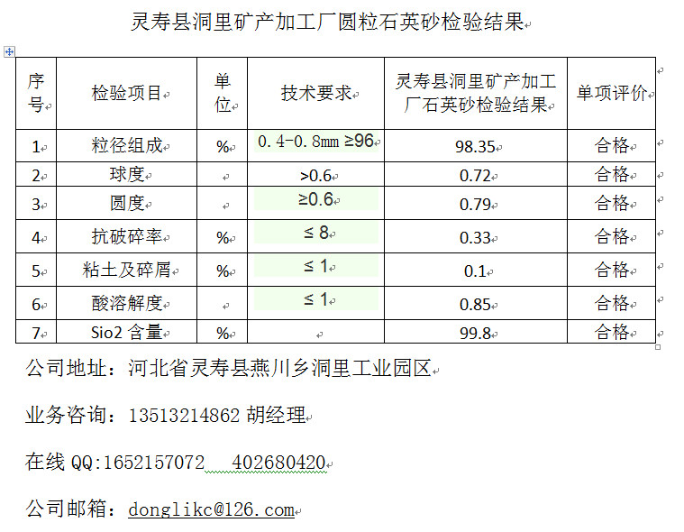 圆粒石英砂,顾名思义就是颗粒是圆的砂子。我厂的圆粒石英砂是经过天然的石英破碎磨圆制成,莫氏硬度高,颗粒浑圆,没有尖角,也没有杂质,圆粒砂的纯度比较高。圆粒石英砂的物理特性大家都可以用肉眼观察到:是无色透明的颗粒或者白色粉末。它主要应用于环氧地坪、过滤材料和耐火材料。因为圆粒石英砂的加工过程要比其他普通石英砂程序繁杂,再加上客户对石英砂的要求比较高,所以圆粒石英砂的价格要高于普通石英砂价格。而促成圆粒石英砂的成单的主要依据就是圆粒石英砂是否达标,这也是客户衡量其性能的主要标准,下面我把我厂圆粒石英砂的检验结果公布于众,我们厂圆粒石英砂各项检验都合格,符合国家标准,请各位新老客户可以放心订购。销售热线:13513214862